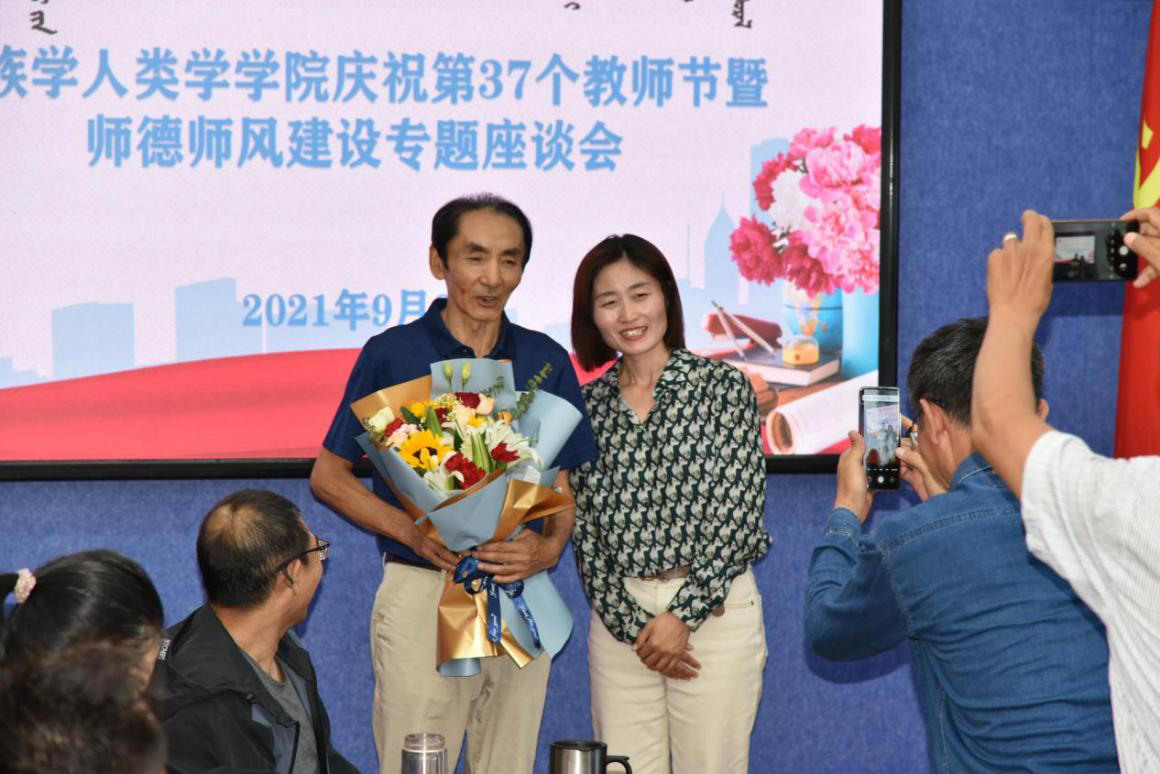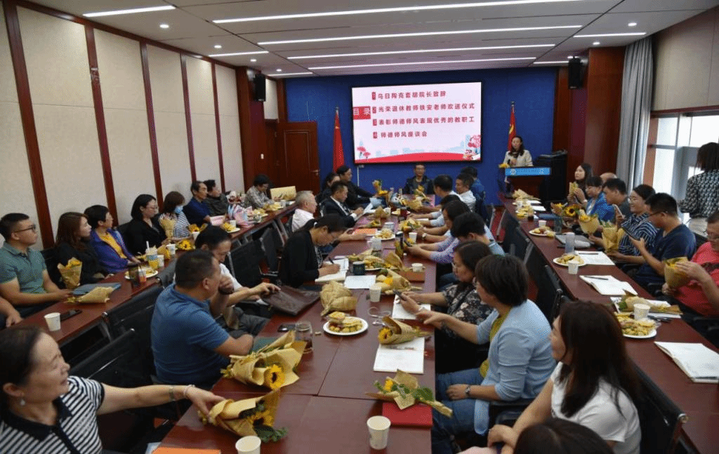 会上院长乌日陶克套胡致辞。乌院长首先向新加入的社会学、社会工作专业的18位老师的到来表示热烈的欢迎!紧接着对学院过去一年的人才引进、教学、科研等方面过的工作进行了回顾。之后对今年光荣退休的铁安老师、在教学、科研和班级管理等方面突出表现的谢咏梅、麦拉苏、陈引弟等几位老师在自己平凡的岗位上勤勤恳恳工作,为教育事业做出无私奉献的精神表示崇高的敬意。乌院长的讲话,充分肯定了教职工对学院发展的功绩,让教职工们感到温暖和荣耀。