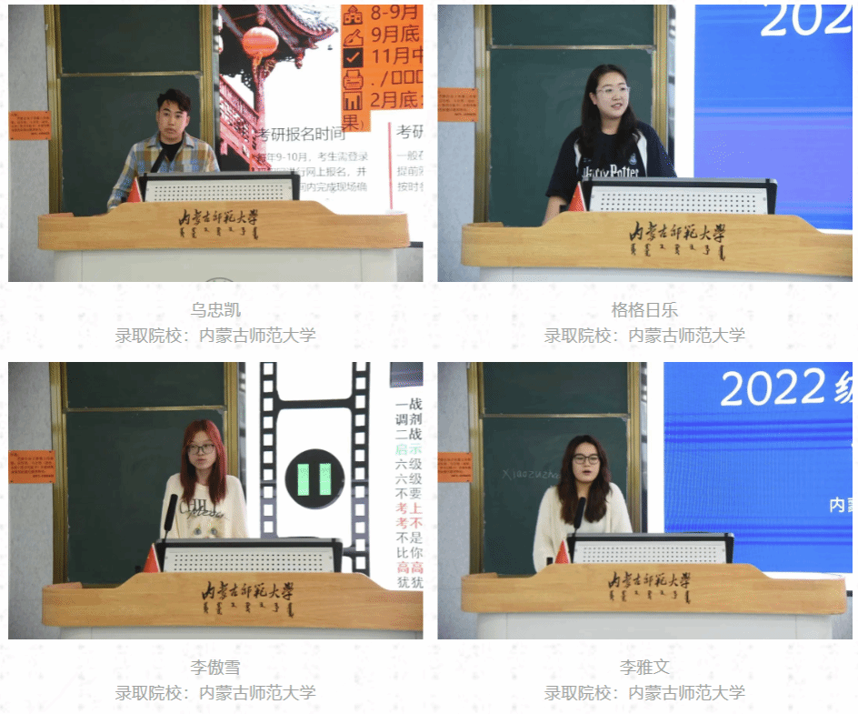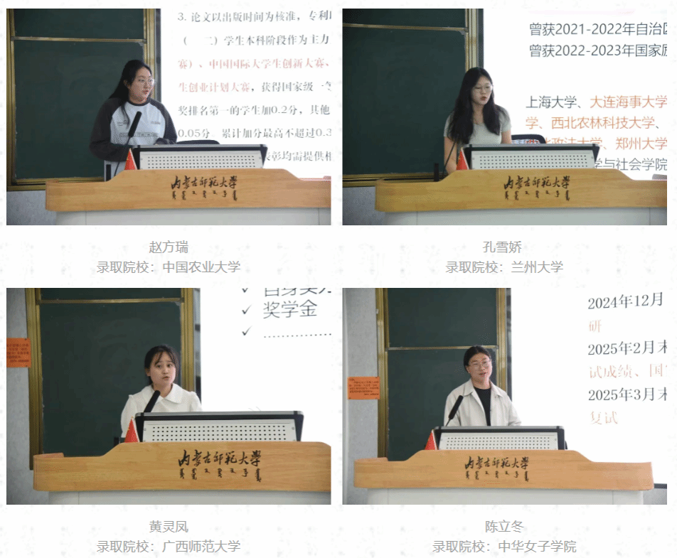 随后,八位成功保研和考研的优秀学子依次上台,分享了他们的成功升学的宝贵经验和心得体会。他们分别从保研的材料筹备和面试经验、备考阶段的时间规划技巧、教辅资料和课程的选择、如何择校与确定目标等方面分享经验。
