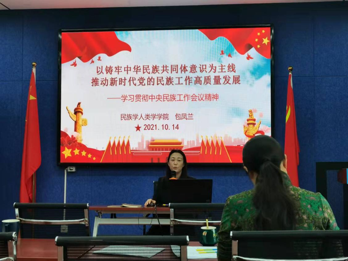 10月14日下午,我院党委书记包凤兰在田楼615会议室为全院教工做了题为“以铸牢中华民族共同体意识为主线,推动新时代党的民族工作高质量发展”的有关中央民族工作会议精神的宣讲。