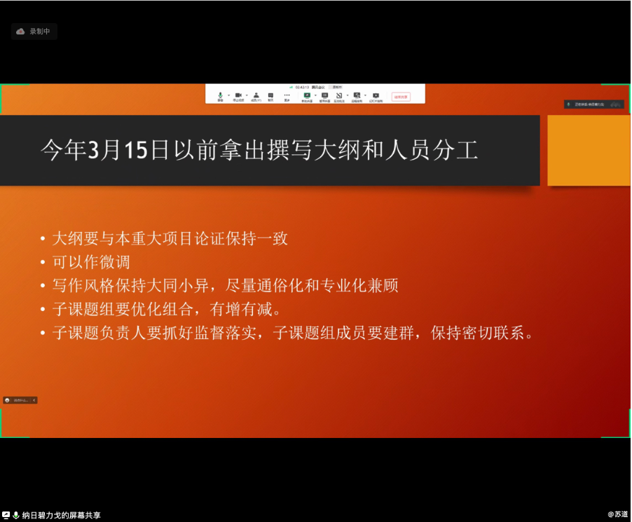 纳日碧力戈教授要求各子课题组全面完整把握好本项目的理论框架撰写思路,布置了2023年度的研究工作和完成进度。