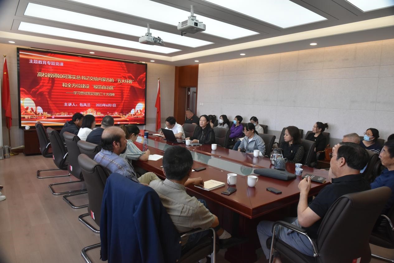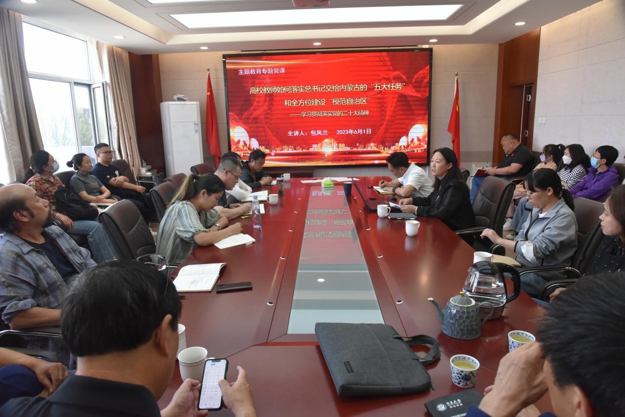 6月1日下午,我院党委书记包凤兰在田楼607会议室为学院教工做“高校教师如何落实总书记交给内蒙古的‘五大任务’和全方位建设‘模范自治区’”的主题教育专题党课。会议由党委委员、副院长满达主持。