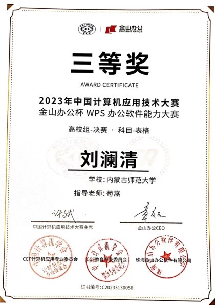 我院2022级社会学3班刘澜清同学在学校选拔赛中荣获“表格赛道”第一名,并被选派代表学校参加了全国总决赛。在全国总决赛中,我校荣获高校组团体第六名,刘澜清同学荣获高校组“表格赛道”个人三等奖。