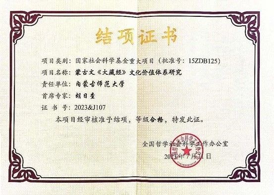 本网讯 近日,我校yl9193永利集团教师胡日查主持的国家社会科学基金重大项目“蒙古文《大藏经》文化价值体系研究”( 15ZDB125 )圆满完成研究任务,在会议鉴定获得同行专家一致肯定的基础上,经全国哲学社会科学工作办公室审批,获“合格”等级,顺利通过结项验收。