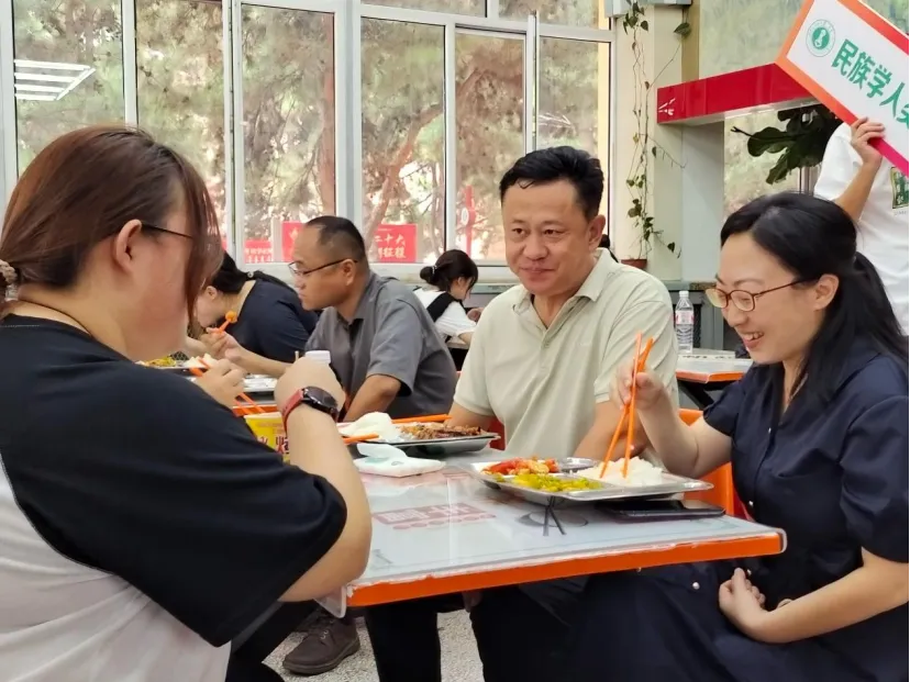 我院在新生报到点为每位新生及家长发放食堂餐券,8月31日中午,我院党委书记包凤兰、党委副书记副院长陆一琼、团总支书记姜鑫、学生工作与就业办公室主任包双成、各新生班班主任与新生及其家长在学校食堂共进“入校第一餐”,让家长和学生们品尝食堂美食,了解学生日常用餐情况,在轻松愉快的氛围中倾听家长的意见与建议,畅谈学生的学习与生活情况,共同探讨孩子的成长策略。