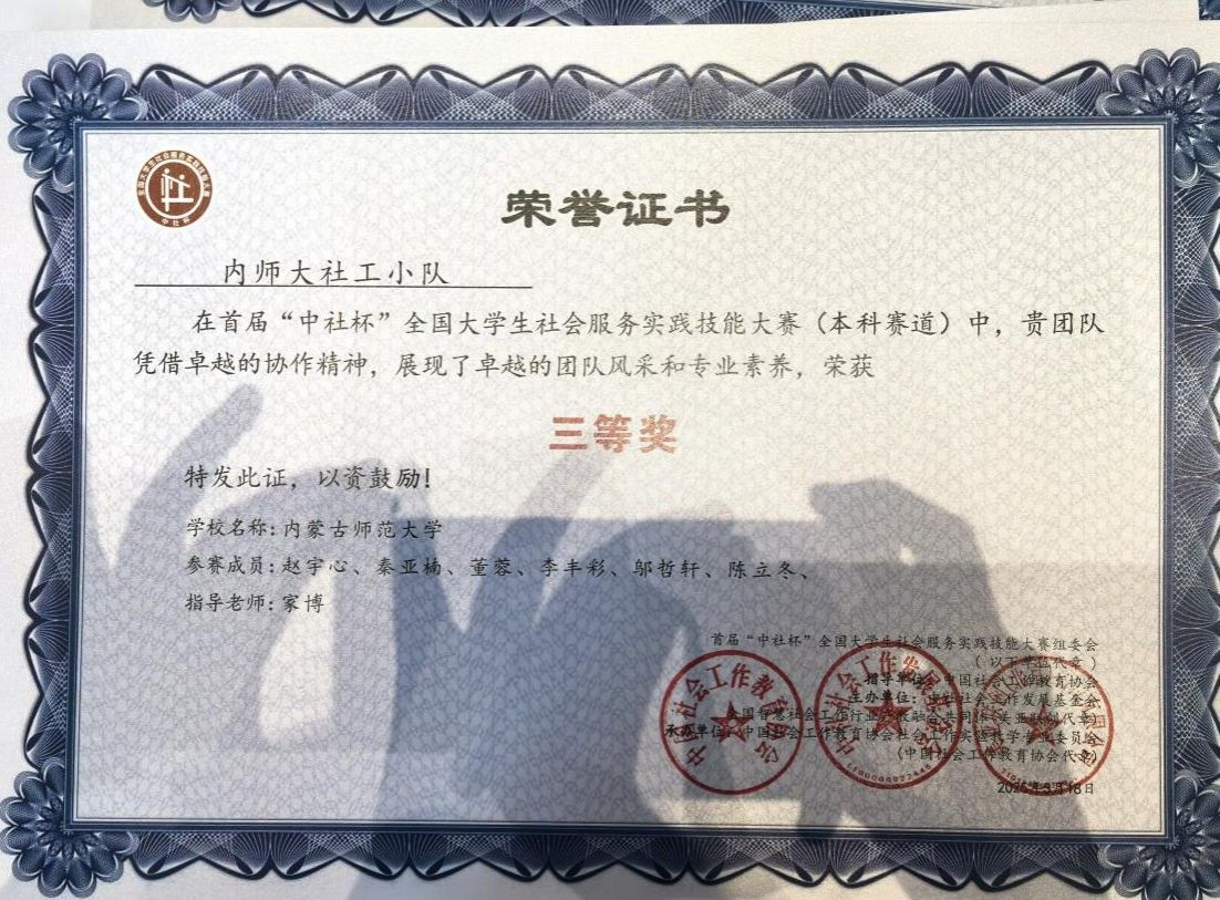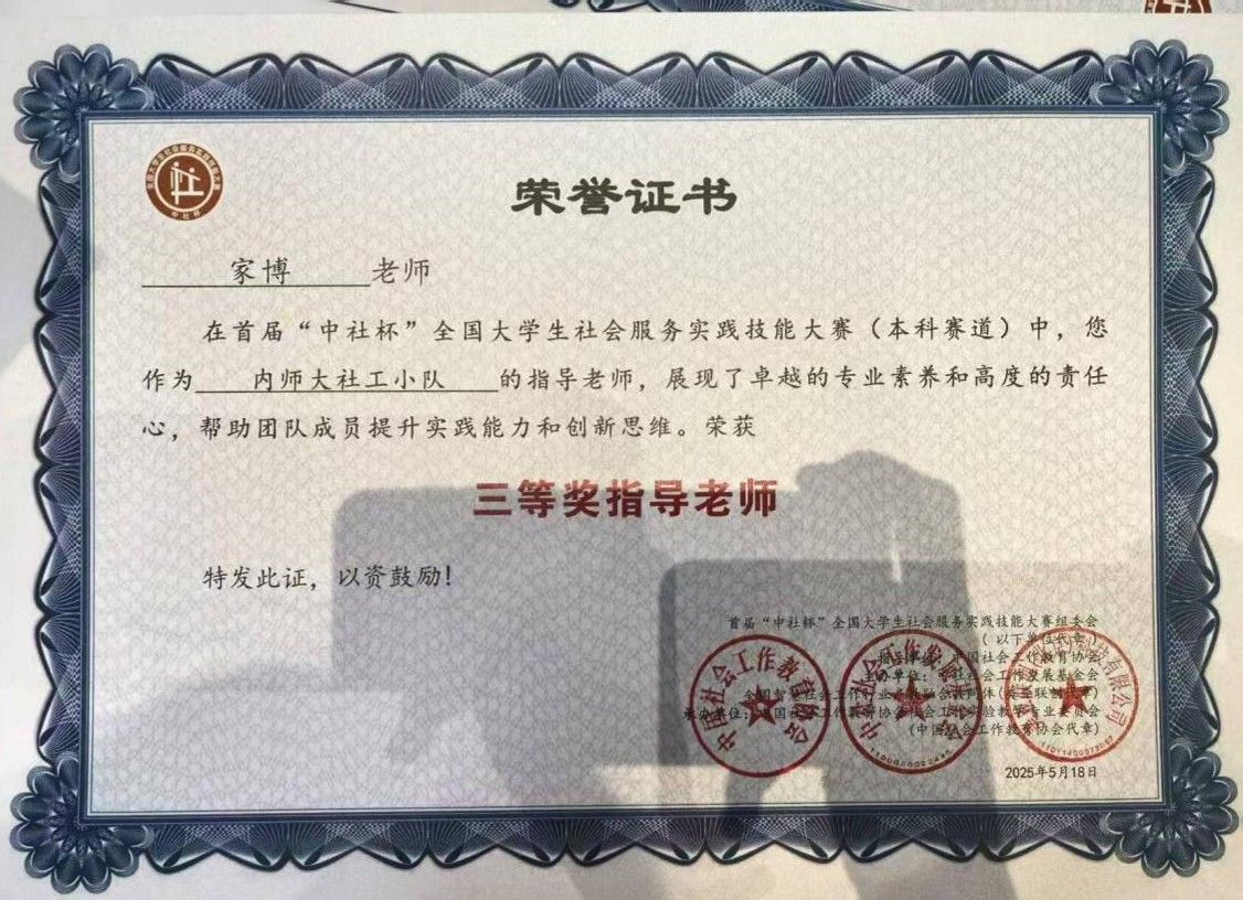 2025年5月16-18日,首届“中社杯”全国大学生社会服务实践技能大赛决赛在中国劳动关系学院举行,我院社会工作专业代表队经过激烈角逐,从全国738支参赛队伍、3000余名选手中脱颖而出,最终荣获全国三等奖。