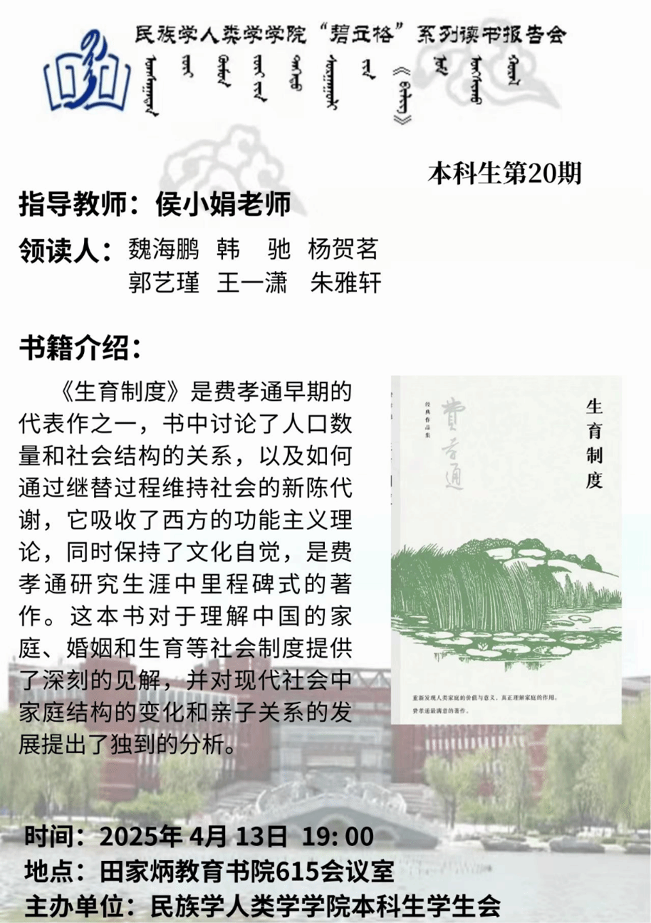 为丰富专业认知、拓宽专业视野,我院秉持笃学致知以夯基础、开卷启思以拓思路、读书明智以塑品格的理念,致力于营造积极向上、勤勉求知的学风。413日下午,本科生第20碧立格系列读书报告会在田家炳教育书院615会议室成功举行。本期读书会由侯小娟老师指导,6位同学领读,阅读书目是《生育制度》。