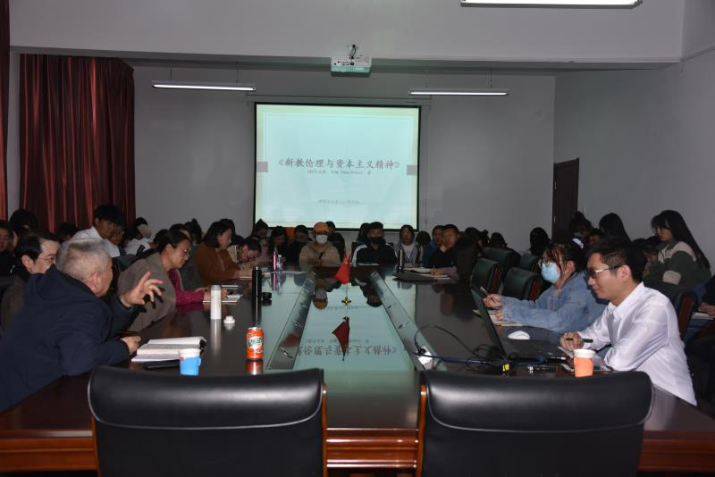 由yl9193永利集团主办的“碧立格”系列读书会第五期于2020年11月1日下午15:00在科研楼201准时进行。本次读书会由民人院博士生付为政主讲,由乌日陶克套胡院长主持。汇报书目是《新教伦理与资本主义精神》。参与本场读书会的成员还包括我院党总支副书记阿荣老师,赵树冈教授,以及博士生硕士生本科生50余人。
