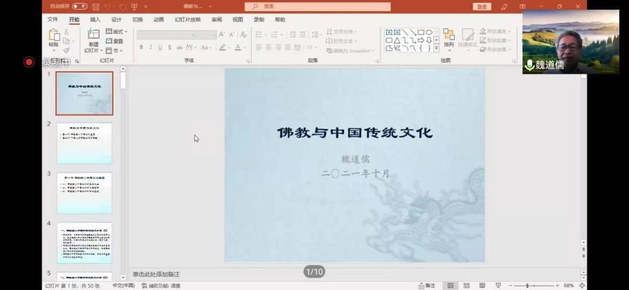 10月26日下午的“佛学文化研究院‘智慧甘露’系列讲座”由满达副院长主持,主讲人魏道儒先生做了题为“佛教与中国传统文化”的精彩讲座。在线参加此次学术活动的包括我院20级民族学本科生和宗教学研究生,此外还有我院与音乐学院、学报编辑部的10余位老师。