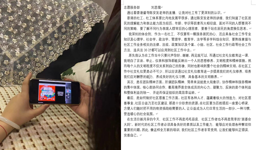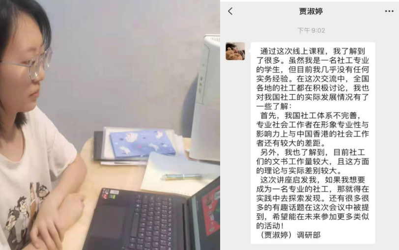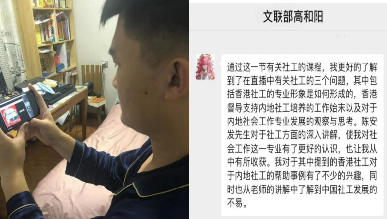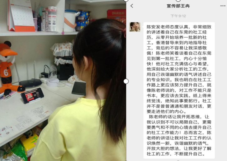 3月16日晚20:00~21:00,第九届社会工作服务站以线上形式组织观看了由道宁会客厅主办的,以“香港督导支持内地社工培养历程”为主题的线上交流讲座。社工站的同学们通过手机,电脑等方式观看了讲座并交流讨论了自己的心得感悟。