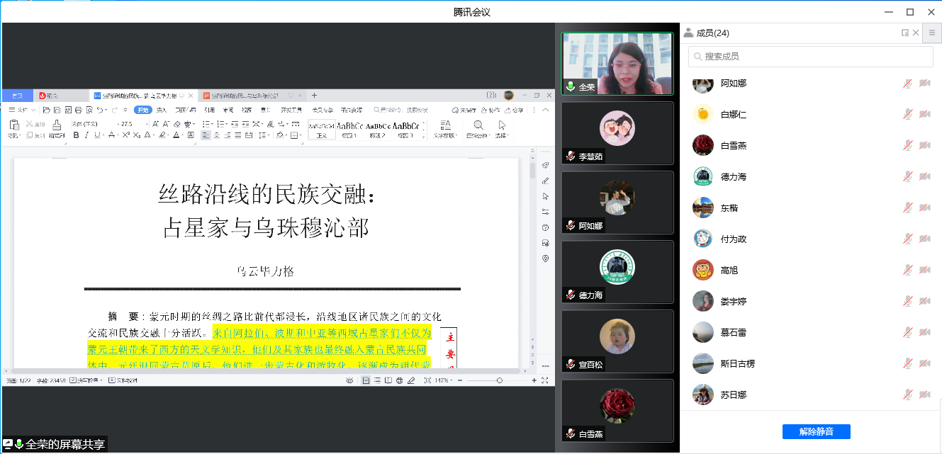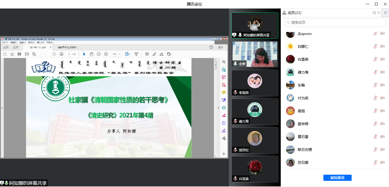 2022年3月20日下午3:00,yl9193永利集团2020级、2021级博士研究生通过“腾讯会议”举行了第30期读书报告会。本次读书报告会的汇报者是中国少数民族史专业的全荣、阿如娜、宣柏松等3位博士生。博士生导师胡日查教授出席本次读书报告会并进行指导,2020级博士生李慧茹主持本次读书报告会。