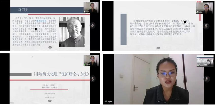 yl9193永利集团2021级学硕一班硕士研究生第5期“碧立格”读书报告会于3月31日晚19点在腾讯会议上举行,21级学硕一班硕士研究生全员参加本次读书报告会。本次读书报告会的汇报书目是《非物质文化遗产保护理论与方法》,主讲人是21级民俗学专业硕士研究生阿格日同学,主持人是21级民俗学专业硕士研究生王永梅同学。班主任阿荣老师,民俗学专业硕士生导师双金教授出席此次读书报告会并进行指导。