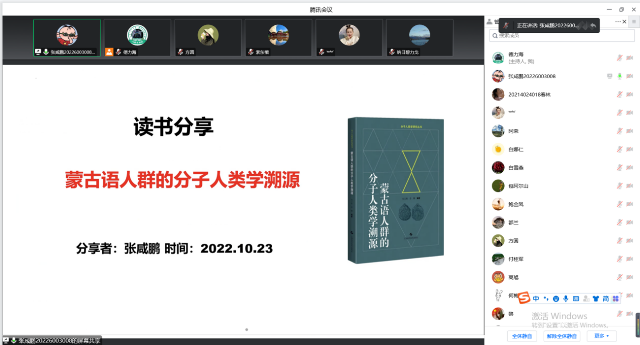 读书报告会共分两个环节进行:第一环节是两位主讲人分别分享《仪式与社会变迁》和《蒙古语人群的分子人类学溯源》两本著作,从作者介绍、著作内容、核心观点等方面进行了较详尽地介绍,并分享了学习心得。