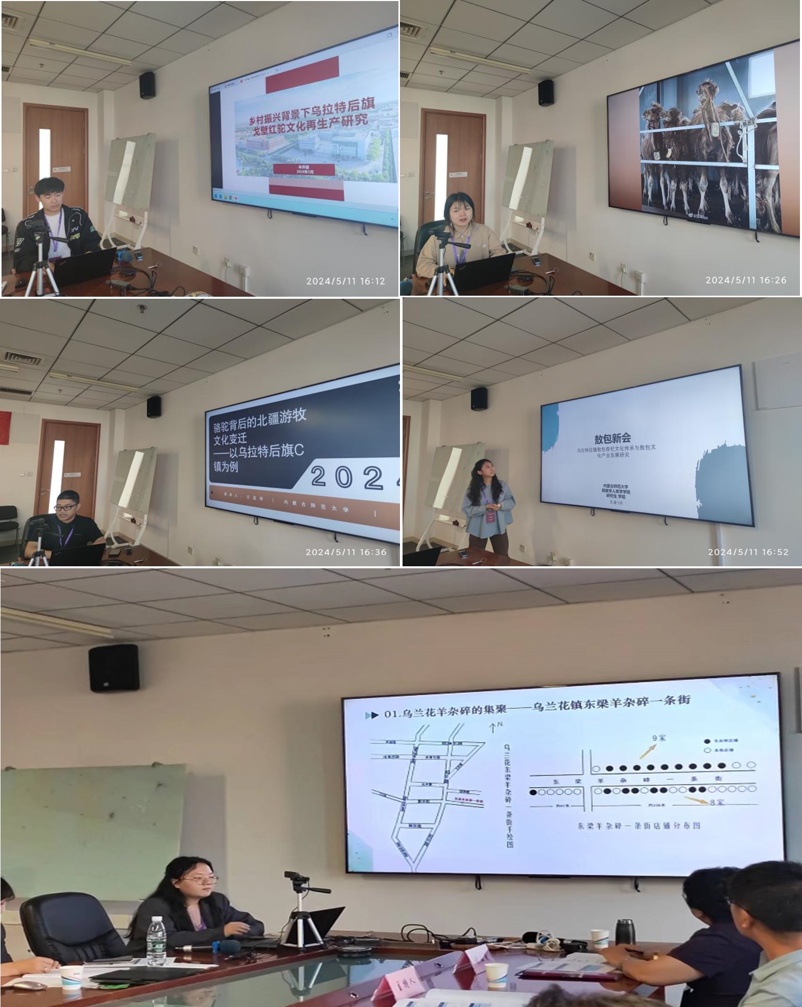 我院乌日格木乐老师带领牟怀超、张圣杰、王孟琦、李韬、杨淑羽等5名硕士研究生参加会议,分别以“乡村振兴背景下乌拉特后旗戈壁红驼文化再生产研究”、“驼乳策力:乡村振兴背景下乌拉特后旗驼奶产业生产模式探究”、“骆驼背后的北疆游牧文化变迁—以乌拉特后旗c镇为例”、“敖包新会:乌拉特后旗敖包祭祀文化传承与敖包文化产业”、“‘晋风蒙韵’饮食人类学视角下的乌兰花羊杂碎”为题做学术报告,赢得了与会老师们的高度认可,获得了广泛好评。